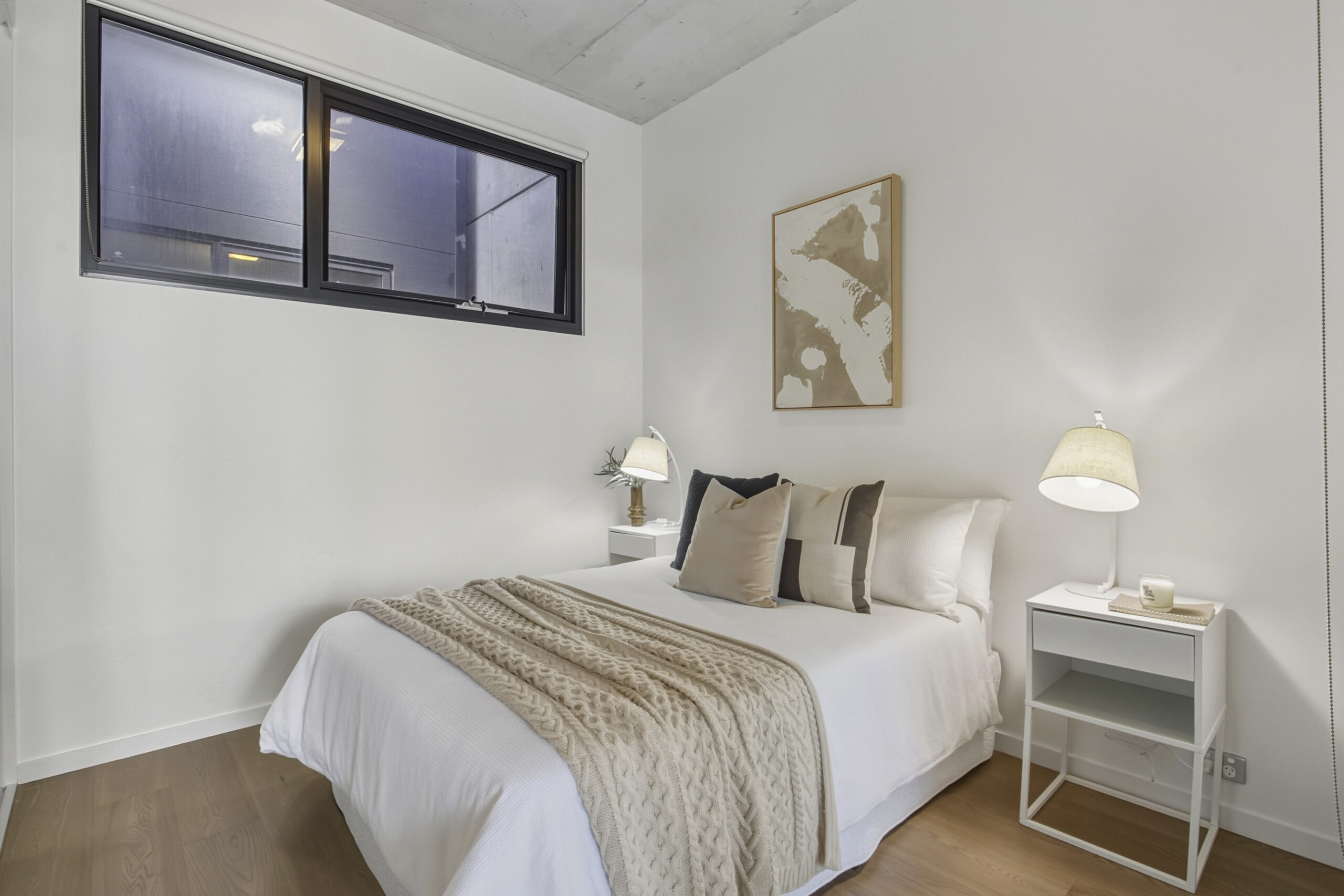 A smartly appointed bathroom and European-style laundry are also offered while concrete ceilings, track lighting and timber flooring adding a touch of effortless sophistication and style. The home also boasts heating/cooling and a secure stacker parking space.