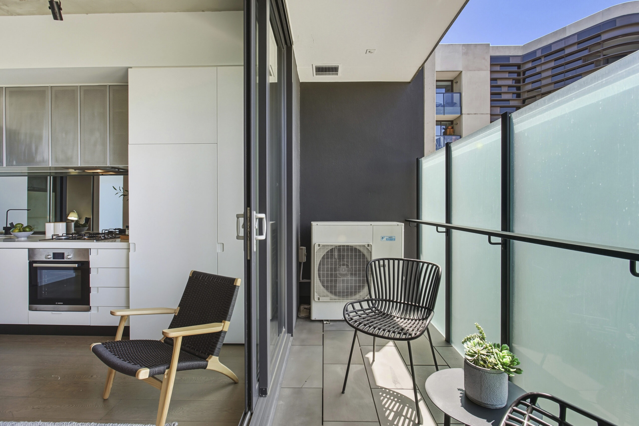 Featuring two bedrooms – either side of a sunny central light-well – the modern interiors include an open plan living/dining zone with chic streamlined kitchen along with an apartment-wide balcony for fresh-air enjoyment.